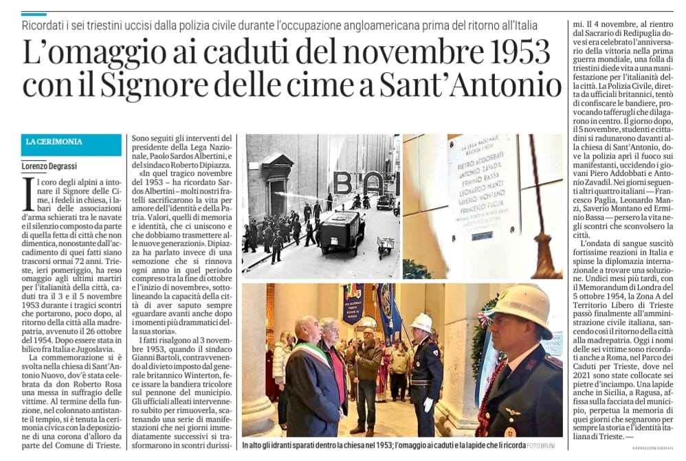 La città di Trieste ha reso omaggio ai suoi martiri caduti per l’Italianità, ricordando i tragici eventi del novembre 1953, quando sei giovani triestini furono uccisi durante le manifestazioni contro l’occupazione angloamericana.