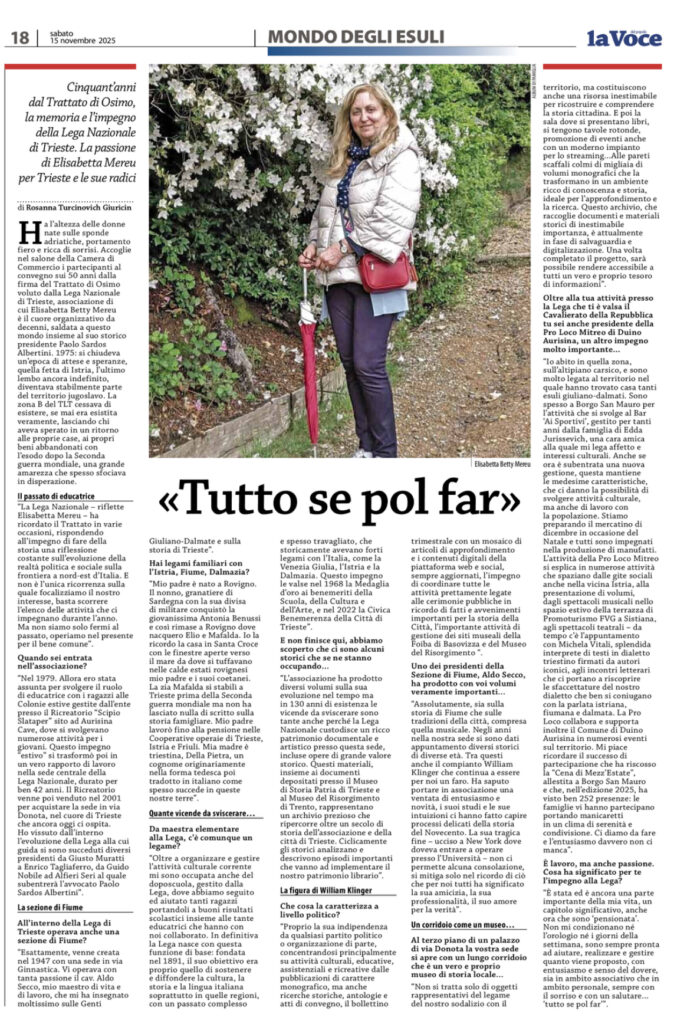 Nel numero del 15 novembre 2025, il quotidiano La Voce del Popolo ha dedicato un ampio articolo alla figura di Elisabetta Mereu, storica anima organizzativa della Lega Nazionale e da oltre vent’anni impegnata nella tutela dell’italianità, della memoria e della cultura del confine orientale.